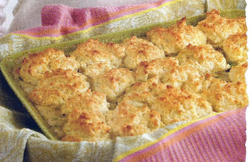 4. In a medium bowl, combine biscuit mix, cheese and milk, stirring until just combined. Drop dough by heaping tablespoons onto cobbler. If using Pillsbury's Country Biscuits, just layer them on top of cobbler.