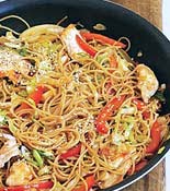 Get all of the remaining ingredients ready for a quick stir-fry. In a large skillet, heat the vegetable oil over high heat. Add the chicken or pork and stirfry until browned, about 3 minutes. Add the cabbage and bell pepper and stir-fry for 2 minutes, then add the scallions and ginger sauce and toss for 1 minute. Pour over the drained noodles and top with the sesame seeds. Pass more hot sauce around the table.