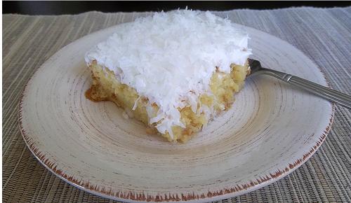 When the cake is completely cool, top with Cool Whip and sprinkle with the desired amount of sweetened coconut flakes.