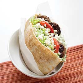 7. Using soupspoon, spread 1/4 cup Tzatziki Sauce inside each pita. Put 1 patty in each pita and top with tomato slices, 1/2 cup shredded lettuce, and 2 tablespoons feta. Serve immediately.