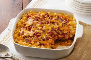 STIR sour cream into prepared Dinner; spoon half the Dinner mixture into 8-inch square baking dish sprayed with cooking spray. Top with layers of meat mixture, 1 cup shredded cheese and remaining Dinner mixture; cover.