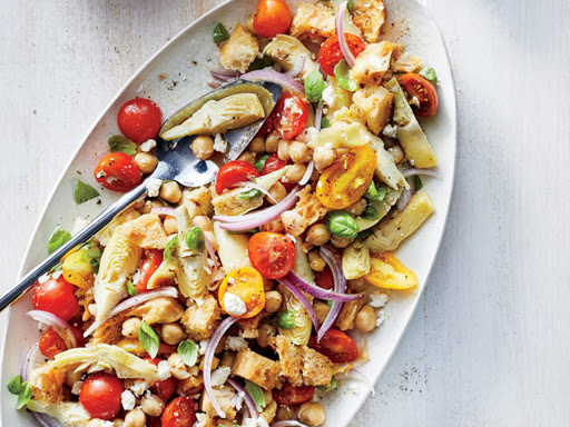 Combine toasted bread, tomatoes, chickpeas, artichoke hearts, feta, onion, and basil in a large bowl.