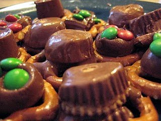 Heat oven to 350 degrees. Unwrap Reese's Peanut Butter Cups. Place pretzels on a nonstick cookie sheet. Place 1 unwrapped peanut butter cup on top of each pretzel. Bake until the chocolate is soft, but not melting (1-3 minutes). Remove from oven and gently press M&M's on top of the soft peanut butter cup. Cool and serve.