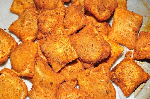 While the oil is heating, put the buttermilk and the bread crumbs in separate shallow bowls. Working in batches, dip ravioli in buttermilk to coat completely, dredge ravioli in the bread crumbs. Place the ravioli on a baking sheet, and continue with the remaining ravioli.