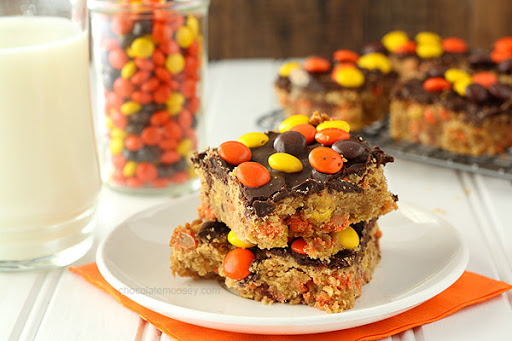 5.Once cooled completely, melt the chocolate in a microwave-safe bowl. Spread in a thin layer on top of the blondies. Top with the remaining 1/4 cup Reese’s Pieces. Let the chocolate cool and harden before cutting into squares.