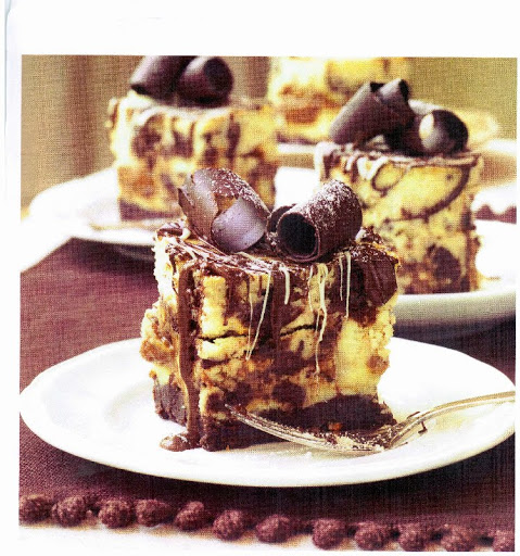Let the cake cool in oven an hour and then in fridge overnight. Remove from pan and unmold onto a serving plate. Before serving, drizzle on melted milk, white and dark chocolate over top, allowing it to drip down on side. On top of melted chocolate, garnish with large chocolate shavings and dust with confectioners' sugar. Serves 16-20