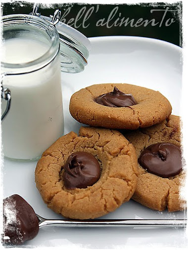 4. Bake for approx 8-10 minutes. CAREFULLY remove tray from oven. Using a 1/2 teaspoon measuring spoon, GENTLY make an indentation in the middle of each cookie. Fill each cookie with a dollop of Nutella. Return tray to oven and continue cooking for 2-4 minutes until golden.