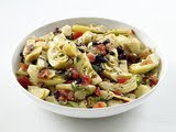 Cook 1/2 chopped onion, 2 chopped garlic cloves and a pinch of salt in a skillet with 1 tablespoon olive oil, 5 minutes. Pour in 1/2 cup white wine and reduce by half. Add 2 chopped tomatoes, two 9-ounce packages frozen artichoke hearts, 3 tablespoons water, 1 strip lemon zest and 1/2 teaspoon salt. Cook, covered, 6 minutes. Stir in chopped olives, basil and salt and pepper.