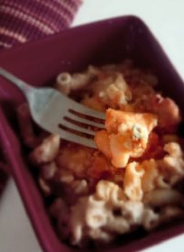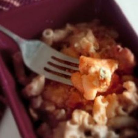 Mix together chicken, pasta and cheese sauce. Pour into lightly greased 9x13 pan. Sprinkle blue cheese or gorgonzola over the macaroni.