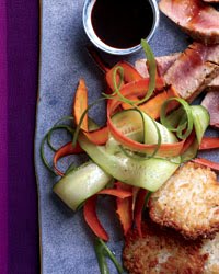 - 1/2 pound Japanese or English cucumbers, peeled and thinly sliced lengthwise on a mandoline