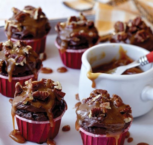 Frost cupcakes; top with toasted pecans. Spoon Caramel Sauce evenly over cupcakes. Store in refrigerator.
