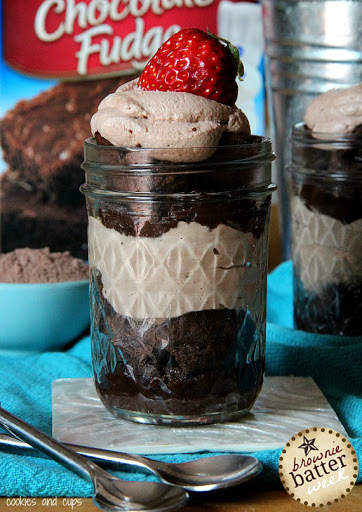 4.In a small 8 oz. jar or parfait dish, layer 2 Tbsp brownie batter, 1/4 cup brownie pieces and 1/4 cup whipped cream. Repeat process 1 more time.