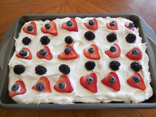 Mix cake according to package, then add in blueberries. Pour into a 9×13 baking pan. Remove from oven and allow to come to room temperature. Then place in the fridge for a minimum of 5 hours and up to two days.