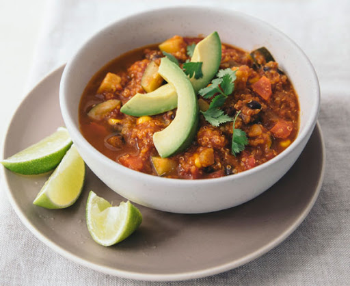 2. Stir in broth, tomatoes, zucchini, beans, corn, quinoa, tomato paste, chili powder, mustard, cumin, garlic powder, onion powder, and oregano, and bring to a boil. Cover, reduce heat to medium-low, and simmer 20 minutes, or until vegetables and quinoa are tender. Season with salt and pepper, if desired. Serve garnished with avocados, cilantro, and lime wedges.