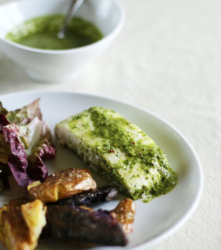 Bake for 12-20 minutes — depending on the thickness of the fish — or until fish is firm and almost opaque all the way through. Serve with a little of the reserved chimichurri sauce spooned over each piece.