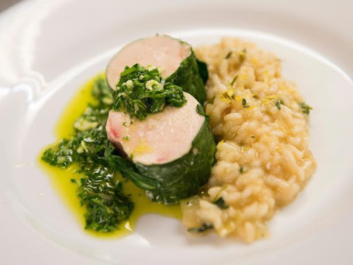 Spinach Wrapped Chicken with Lemon Risotto and Feta Cheese Salsa Verde