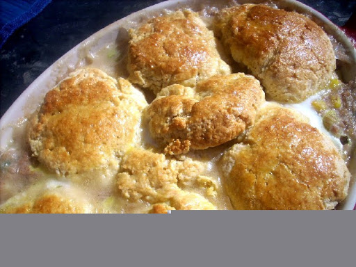 Pour filling in a casserole dish and top with reserved biscuits. Bake until bubbly and biscuits are golden brown, about 30 to 35 minutes.