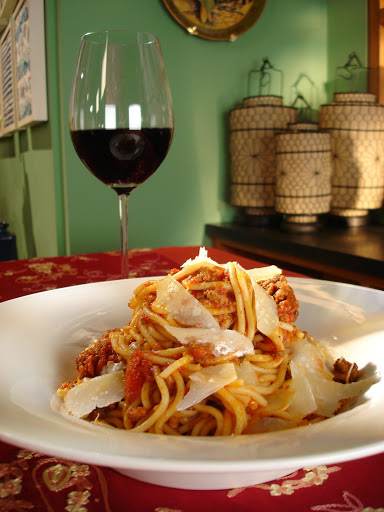 Coat a stock pot over medium-high heat lightly with olive oil and sauté onions and garlic until translucent, about 2 minutes. Add the meat, season and saute until browned, about 5 minutes. Add the tomatoes with liquid, naturally brewed soy sauce and basil and bring to a simmer. Taste for flavor and simmer until reduced by 20%, about 1 hour. Combine blanched spaghetti with sauce in pasta pot, and eat.