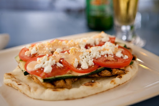 Remove bread to your service plate. Brush the zucchini slices with olive oil, season with salt and pepper, and grill both sides till just cooked through. Layer grilled zucchini onto grilled naan bread. Top zucchini with layers of thin sliced tomato. Wipe off excess marinade from chicken. Add a touch of oil to the hot grill pan and grill chicken till cooked through. Top your sandwich off with the chicken slices. Sprinkle sandwich with the crumbled feta cheese. Drizzle the sandwich with the Sriracha Hippy-Shake. Eat proudly with a knife and fork.