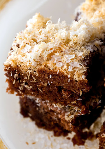 3. Pour half the batter into the prepared pan and smooth with a spatula. Sprinkle 1 cup of the shredded coconut on top of the batter. Pour in the remaining batter and smooth. Top with remaining coconut. Sprinkle with fleur de sel and bake until just set and firm to the touch, about 25 to 30 minutes. (These brownies solidify as they cool, so inserting a toothpick to check for doneness will not work here; it does not come out clean.) Transfer the pan to a wire rack and allow to cool for at least 1 1/2 hours before cutting into 1-inch squares.