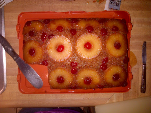 - In medium bowl, stir remaining ingredients, scraping bowl constantly. Pour batter over pineapple and cherries.