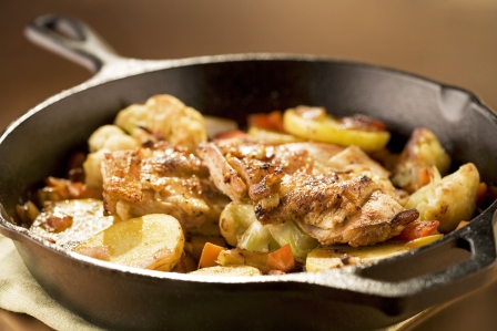 4. Return the chicken to the pan on top of the vegetables and place in the oven. Cook about 10 minutes until the chicken is cooked through. Serve right in the pan.