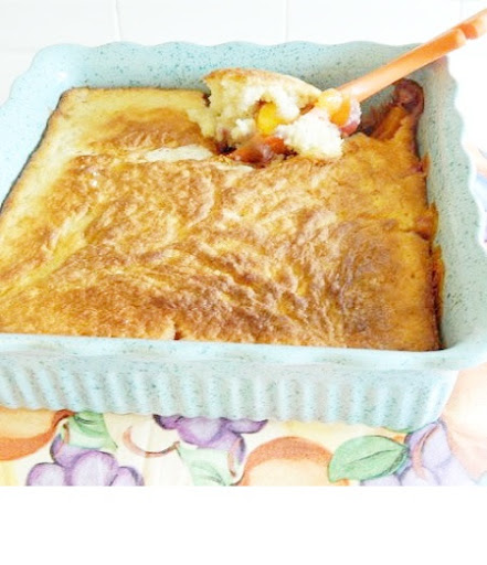 Combine all batter ingredients and pour over peaches. Bake at 375 degrees for 50 minutes. (I placed a piece of foil over the cobbler for the last 15 minutes of baking, so the top wouldn't brown too much.) Top with vanilla bean ice cream. YUM!