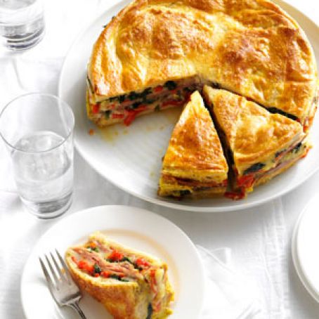 Layer crust with half of the ham, salami, provolone cheese, red peppers and spinach mixture. Pour half of the egg mixture over the top. Repeat layers; top with remaining egg mixture.