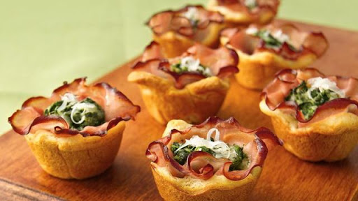 Pat each ham slice dry with paper towel. Place 1 ham slice over dough in each cup (edges of ham will be higher than side of cup.) Spoon rounded 1 teaspoon spinach mixture onto ham in center of each cup.