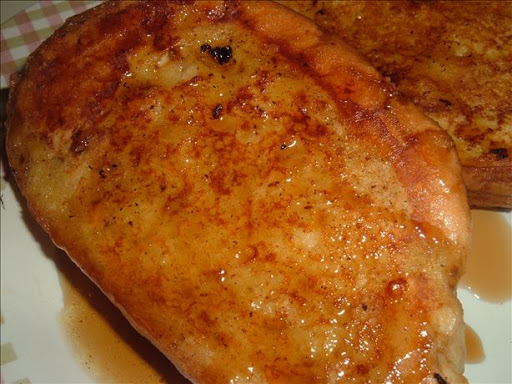 1 Mix together the eggs, milk, flour, sugar, vanilla, salt& cinnamon. 2 Heat a large skillet, or griddle. 3 When the skillet is hot, add 1 tablespoon butter. 4 If the butter smokes, your pan is too hot; turn down the heat. 5 Dip each slice of bread into the batter for 30 seconds on each side. 6 Let some of the batter drip off, then put in skillet. 7 Cook each slice 1 1/2-2 minutes per side until each side is golden brown. 8 Add more butter, if necessary, to cook all of the slices. 9 To serve, put on plate, dust with powdered sugar. Serve with butter & hot syrup.