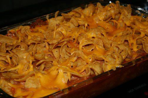 Cook ground beef until meat is browned; drain. Stir in beans, tomato sauce, diced tomatoes, taco seasoning mix and 1/4 c. of cheese. Sprinkle 1 cup corn chips in bottom of 8x8 baking dish. Cover with chili. Bake at 350 for 20 minutes. Spread sour cream over chili. Top with remaining corn chips and cheese. Bake 4-5 minutes longer.