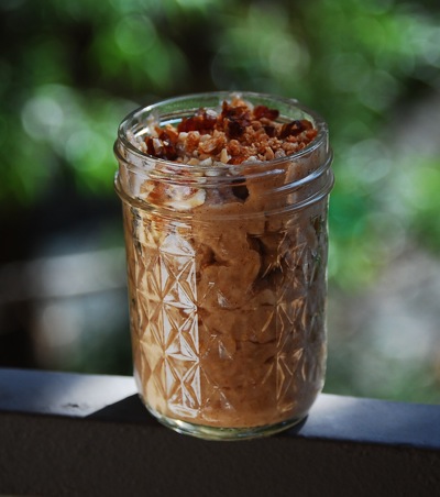 Scoop out your serving and top with your favorites. Mine are dried fruit (dates), granola, and nuts (cashews this time, but almonds, peanuts, sunflower seeds, and sesame seeds are also great).