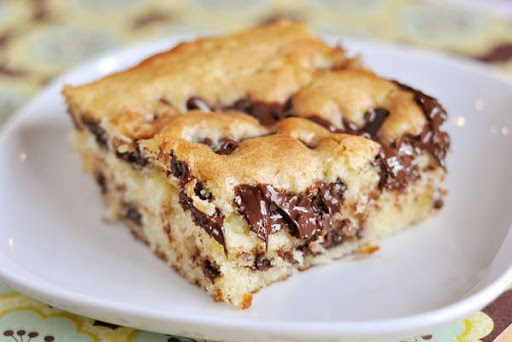 Preheat oven to 350 degrees (325 if using a glass pan). Grease a 9 X 13 pan with cooking spray. In a large bowl combine all of the cake batter ingredients. Mix for 1 minute at low speed; mix 3 minutes at medium speed. Pour 1/2 of batter into greased pan. Generously sprinkle cinnamon and sugar over batter making sure to get the corners and then sprinkle with 1/2 bag of chocolate chips. Pour remaining cake batter on top and spread across bottom layer. Repeat with cinnamon and sugar and chocolate chips. Bake for 30-35 minutes or until a toothpick comes out with only a few crumbs (don’t overbake or cake will be dry!).