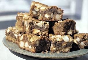 Reduce the speed to low, add the flour and mix in. Continuing to mix on low speed, fold in the nuts and white chocolate just until blended. Spread the batter in the prepared pan.