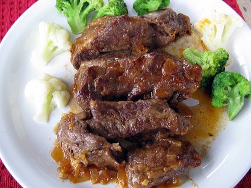 Place ribs in 3-4 qt slow cooker, cover w/onion, sprinkle w/pepper, mix gravy & gravy mix (dry) pour over top.