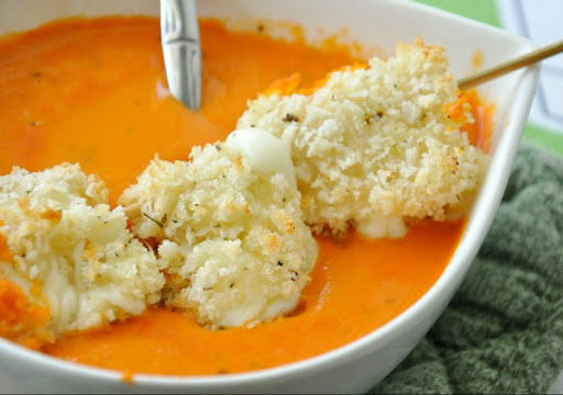 Preheat oven to 425F. Keep mozzarella cubes frozen until you have everything set up and ready to go! *Ahem* Don't let your balls thaw. Combine seasoning blend and panko in a shallow bowl, and egg white and flour into separate bowls as well. Next, line a baking sheet with aluminum foil and top with a wire cooling/baking rack. Ready? Grab your mozzarella from the freezer and prepare to be amazed at how easy this is. Dip the frozen cheese in the flour, then the egg, and finally roll around in panko to coat. Pop it on the wire rack and repeat for the remaining mozzarella cubes. Spray each ball with cooking spray and bake at 425 for approximately 10 minutes. When golden brown, remove from oven and serve atop a piping hot bowl of tomato soup. Grilled cheese is so 10 seconds ago =)
