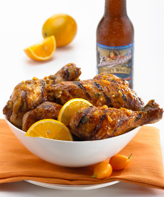 Add 1/3 cup liquid from orange can and oranges to onion mixture and continue to sauté until juice is reduced. Turn heat to low and add Maple syrup, soy sauce, Leinie’s Sunset Wheat, ginger and pepper. Simmer for 10 minutes. Prepare charcoal. Place chicken in baking dish and bake at 350° for 1/2 hour. Place partially baked chicken on grill and baste with Leinie’s Sunset Grilling Sauce until done. You may want to make extra sauce to serve with grilled chicken.