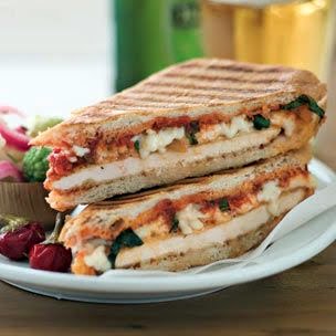 Place 1 piece of chicken on the bottom of each roll and top with 1/3 cup mozzarella, 1 Tbs. basil and 1/4 cup tomato sauce. Cover with the top halves of the rolls. Place 2 of the sandwiches on the preheated panini press, close the lid and cook until the cheese is melted, 3 to 4 minutes. Transfer the sandwiches to a cutting board and cut in half. Repeat to cook the remaining sandwiches. Serve immediately.