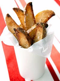 Cut the potatoes lengthwise into 1/2-inch-thick wedges. Transfer to a large bowl. Add remaining olive oil; toss to coat. Sprinkle potato wedges with the salt and black pepper, tossing to coat. Arrange potatoes in a single layer on prepared baking sheet.