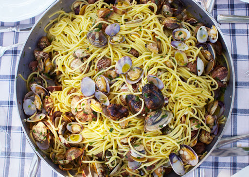 Heat 2 Tbsp. oil in a large pot with a lid over medium heat. Add ¼ cup wine, 1 garlic clove, and 1 chile. Add half of clams, cover, and cook over high heat, shaking pan frequently, until clams open (keep lid on pot so heat is not released, making cooking time longer). As soon as clams open, transfer clams and their juices to a large bowl (discard any clams that do not open). Repeat process with 2 Tbsp. oil, remaining ¼ cup wine, 1 garlic clove, 1 chile, and remaining clams.