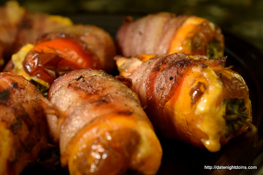 Slice peppers lengthwise being careful not to slice all the way through. Remove seeds, Patti uses a melon baller. In a small bowl mix well remaining ingredients, except the bacon. Use a small spoon to stuff peppers with crab mixture. Wrap with a slice of bacon and secure with a toothpick. Preheat your grill grates to 350 degrees (177c) and place your peppers directly on them. Roll them in about 10 minutes. They will be done when the bacon is cooked to your taste. I use a Maverick ProTemp Instant Read Thermometer for checking meat temps.