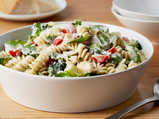 Bring a large pot of water to a boil, add 1 tablespoon of salt and the pasta, and cook according to the directions on the package, about 12 minutes, stirring occasionally. Drain the pasta in a colander and place it back into the pot. Immediately add the cream mixture and cook it over medium-low heat for 3 minutes, until most of the sauce has been absorbed in the pasta. Pour the hot pasta into a large bowl, add the arugula, Parmesan, tomatoes, and cooked broccoli. Cut the last lemon in half lengthwise, slice it 1/4-inch thick crosswise, and add it to the pasta. Toss well, season to taste, and serve hot.