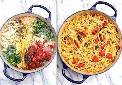 Throw it all in the pot, INCLUDING the uncooked Pasta, and cook! - Bring it to a boil, then reduce to a simmer. The starch leaches out of the pasta and makes a rich, warm sauce for the noodles. The other ingredients cook right along with the pasta