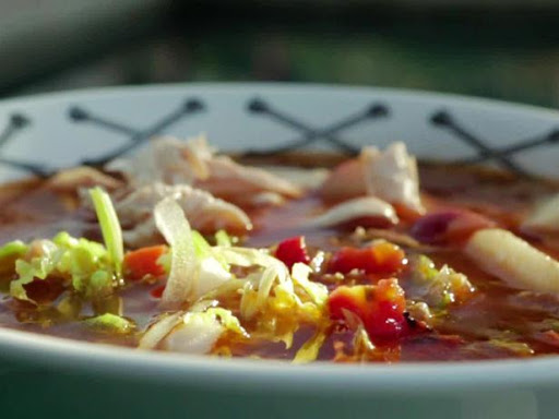 Pour in the reserved stock and the tomatoes. Add the Parmesan rind and simmer 12 to 15 minutes; the vegetables should be tender. Remove from the heat. Add the navy beans and shredded chicken and stir to combine. Season with salt and pepper.
