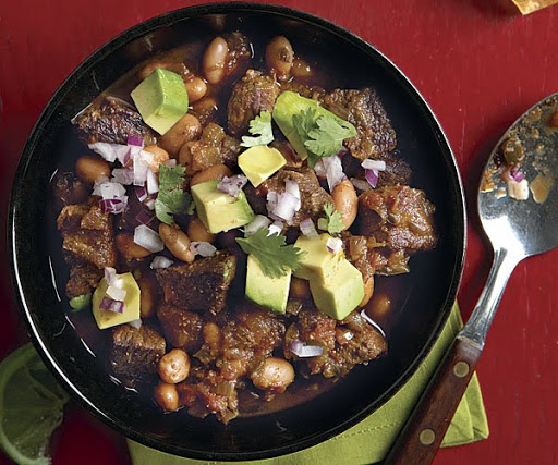 Return the beef to the pot, along with any accumulated juice. Add 2-1/2 cups water, the tomatoes and their juice, 1 Tbs. of the lime juice, and 1 tsp. salt. Bring to a boil over medium-high heat; then reduce the heat to low and simmer, covered, for 1-1/2 hours. Remove the lid and simmer until the meat is tender, about 30 minutes more. Add the beans, raise the heat to medium high, and stir until the beans are heated through, about 5 minutes. Add the remaining 1 Tbs. lime juice and season to taste with additional salt.