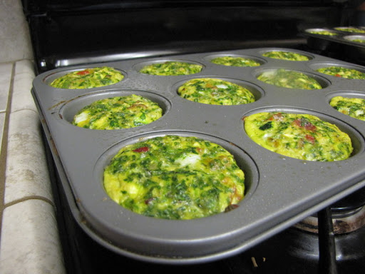 Preheat oven to 350 and grease two muffin pans with LOTS of coconut oil, butter, or ghee. Whisk all your eggs in a big bowl. In a food processor throw in the green onion, zucchini, bacon, and peppers and process until finely chopped but NOT smooth (yuck…). Add this mixture to your eggs. Throw your spinach into the processor and finely chop and also add to your eggs. Mix the egg mixture well and using a 1/4 measuring cup, fill the muffin pans (you’ll be able to make 18-20 cupcakes). Bake for 20-25 minutes or until the eggs are set in the middle. These are great to take on the go and I like mine with some sliced avocado and green salsa.