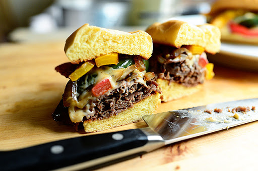 To build the sandwiches, place a pile of beef on the bottom half of each roll. Spoon cheese sauce over the beef. Top with peppers and onions, then top with more cheese sauce. Place the top half of the roll on top and serve immediately!
