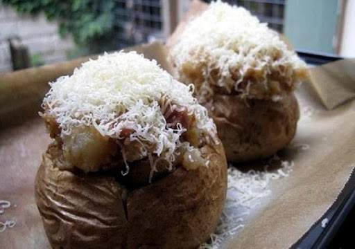 Scoop the mixture back into the potato casing. Add the rest of the grated cheese and back into the oven for 10mins or till all the cheese has melted