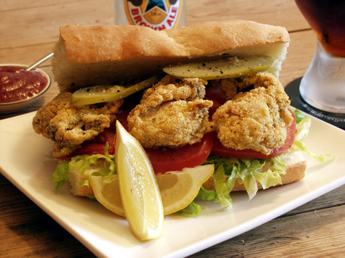 Cut the bread into 2 or 3 sandwich-sized pieces, spread with tartar sauce or mayo, dress with lettuce, tomatoes and pickles. Divide the oysters evenly among the bread and season with salt & pepper. Serve with cold beer and cocktail sauce on the side.
