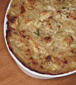 Brandade is a salt cod puree from Provence. In this all-American take on the dish, an heirloom bean puree is mixed with Dungeness crab and two kinds of cheese.